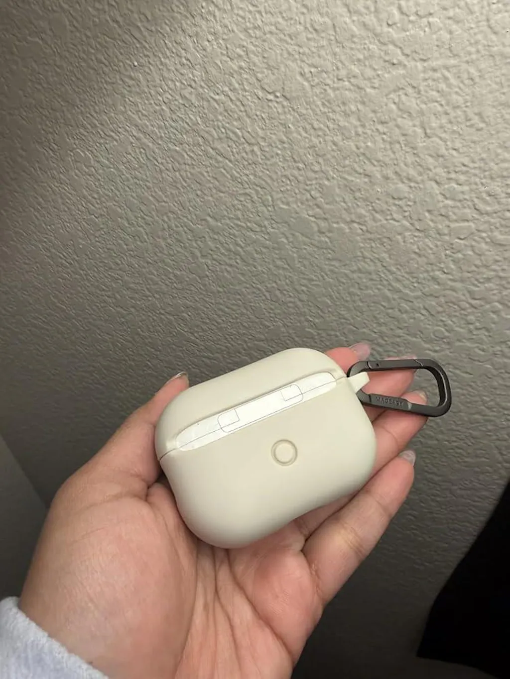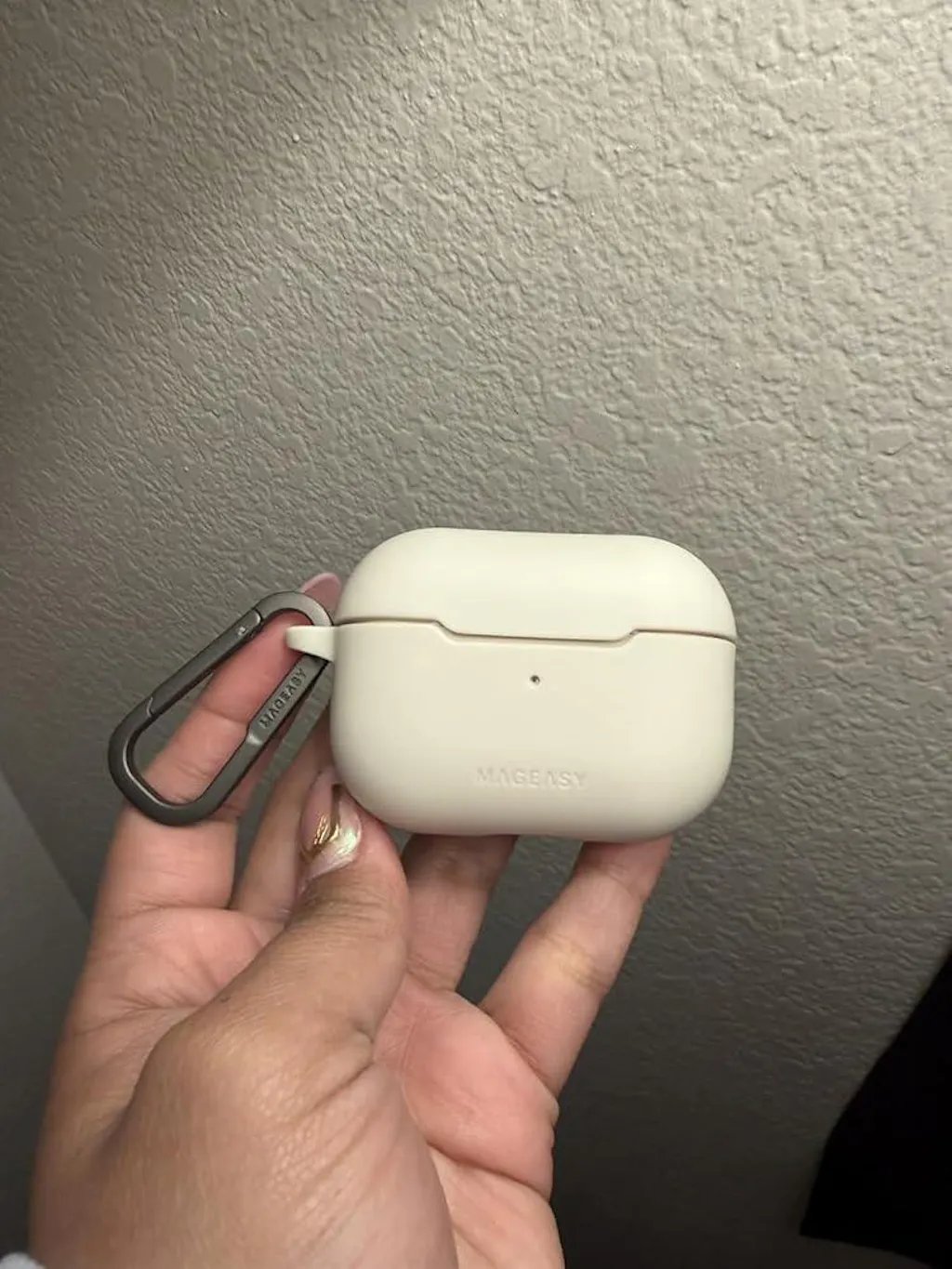Durable carabiner attaches to the AirPods case for easy transport and compatibility with MAGEASY straps & strap bags.
